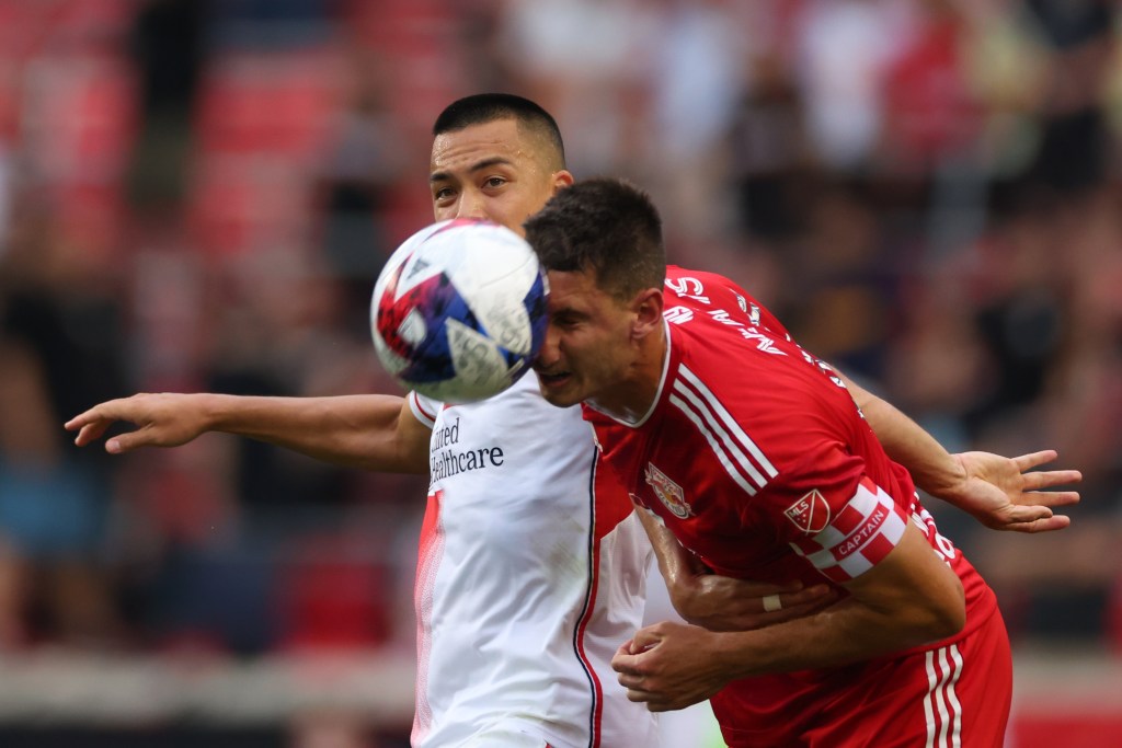 Omir misses the far post twice in a row now, not even close to getting it on the frame, on the last attempt he is bailed out by a misplay from the Revolution defense. The corner kick attempt is handled by New England easily and the danger is adverted in the 17′.