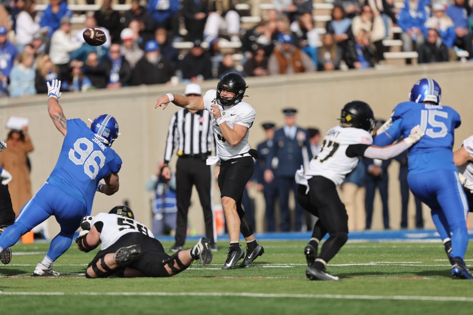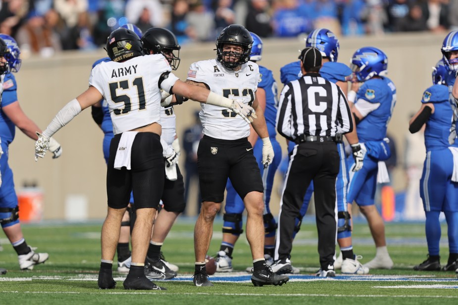 That Army drive chewed up over half of the fourth quarter. With Air Force looking for back-to-back scores, Liam Szarka and the Falcons were able to move the ball downfield with ease. But with Air Force knocking on the door of the endzone, Army defensive coordinator Nate Woody cooked up a blitz off the left side of the line, and sophomore Cole Searight was able to strip Szarka before he could throw it.